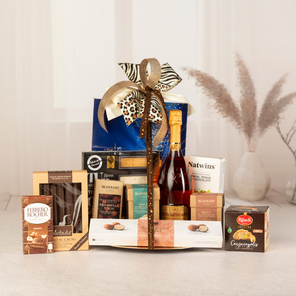 Combina vins, dolços, conserves, formatges i petits detalls amb una presentació impecable.