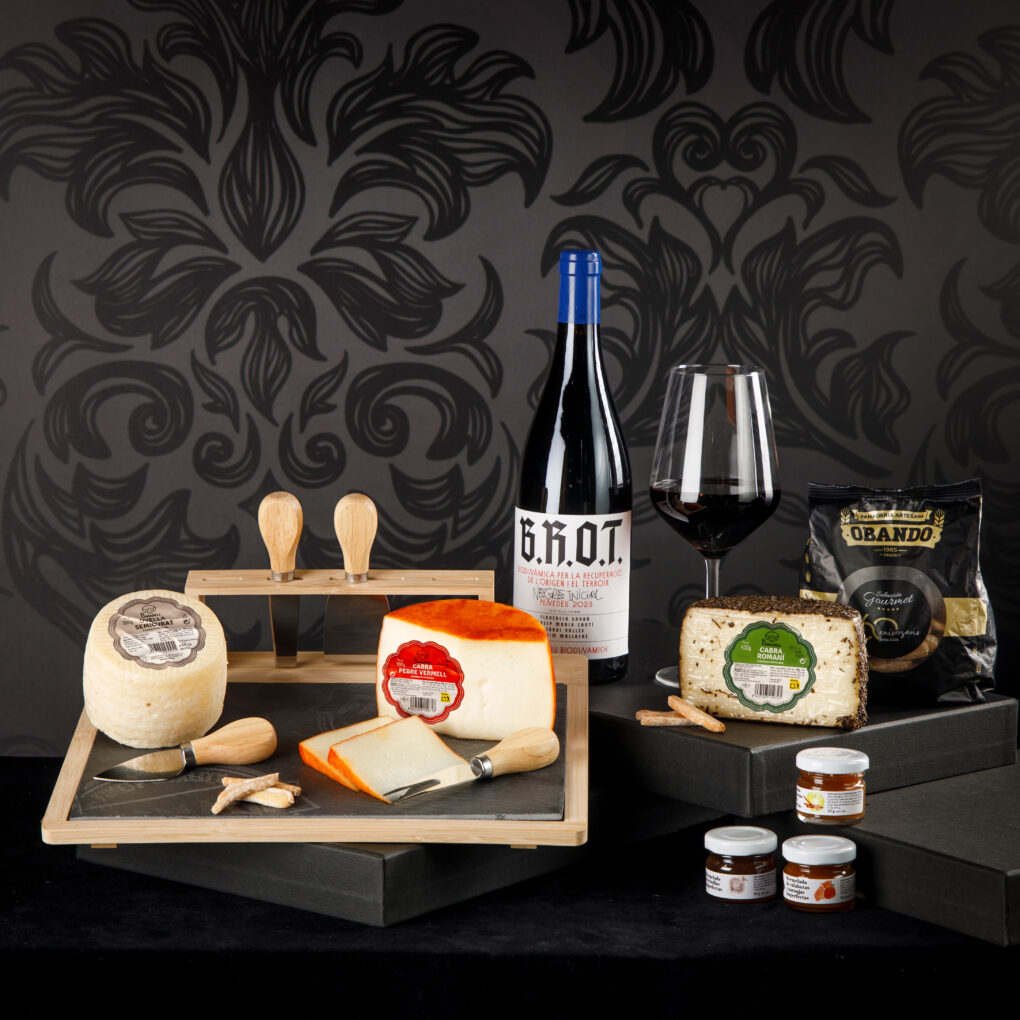 🧀 Proposta Llobet Regals: selecció d’embotits artesans i formatges locals amb presentació de fusta natural i cinta de lli.
